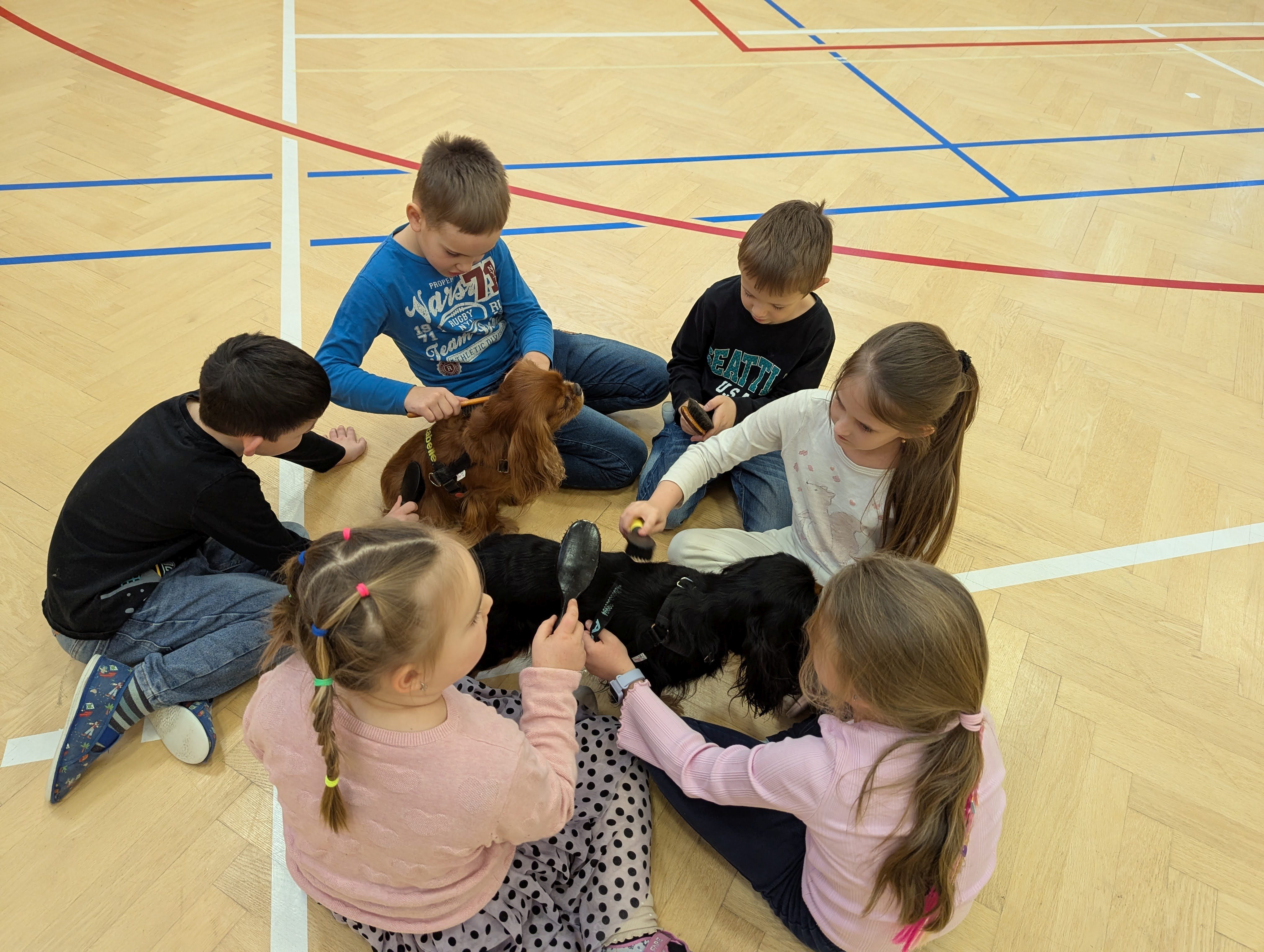 Zlatým hřebem měsíce byla návštěva chovatelek s úžasnými psy rasy Kavalír King Charles španěl. Dozvěděli jsme se spoustu zajímavostí o tom, jak se o pejsky starat, co mají rádi a jak se k nim správně chovat. Největší odměnou pro všechny bylo samozřejmě společné mazlení, hlazení, krmení pamlsky, česání a vodění těchto psích gentlemanů.