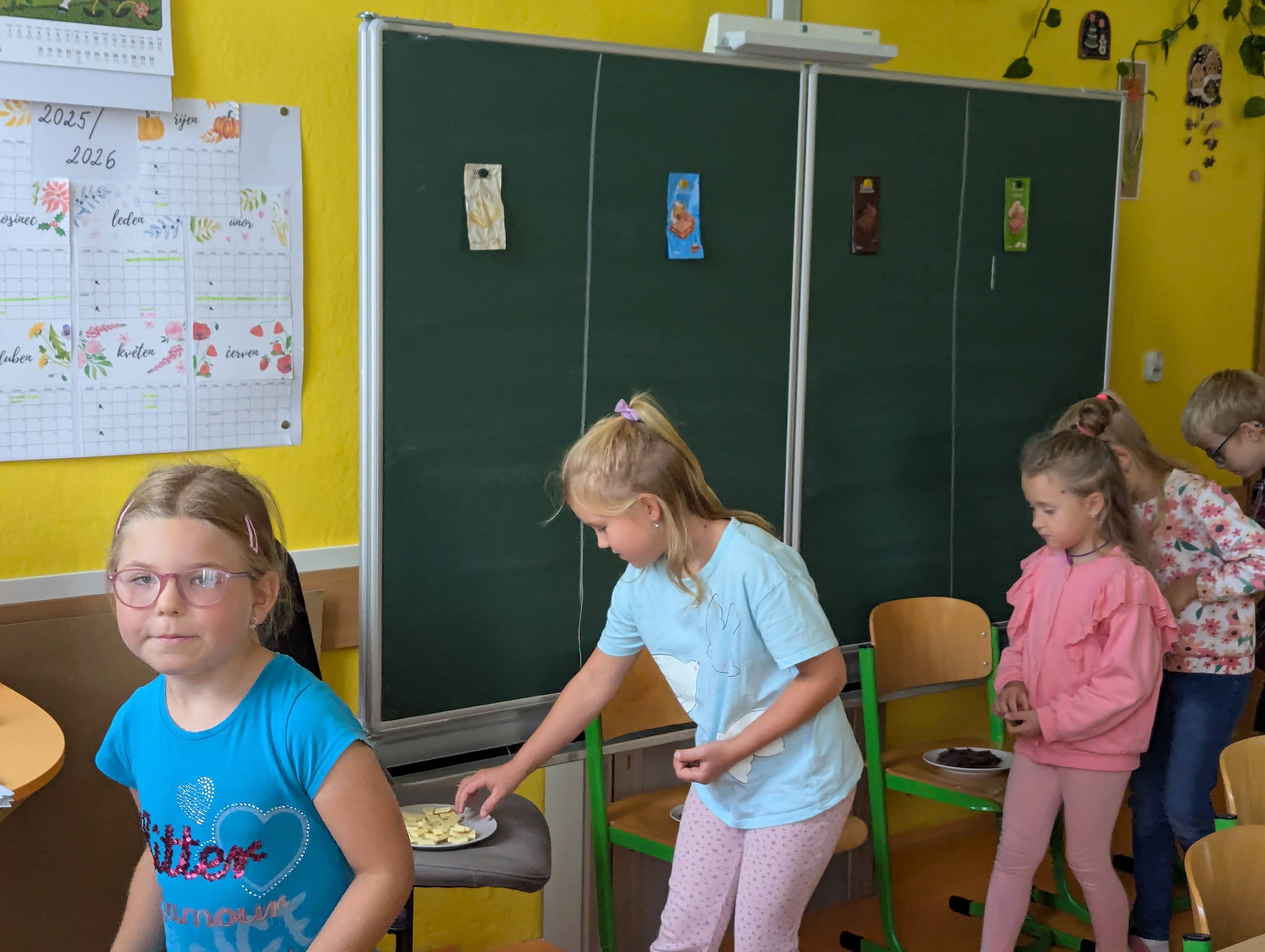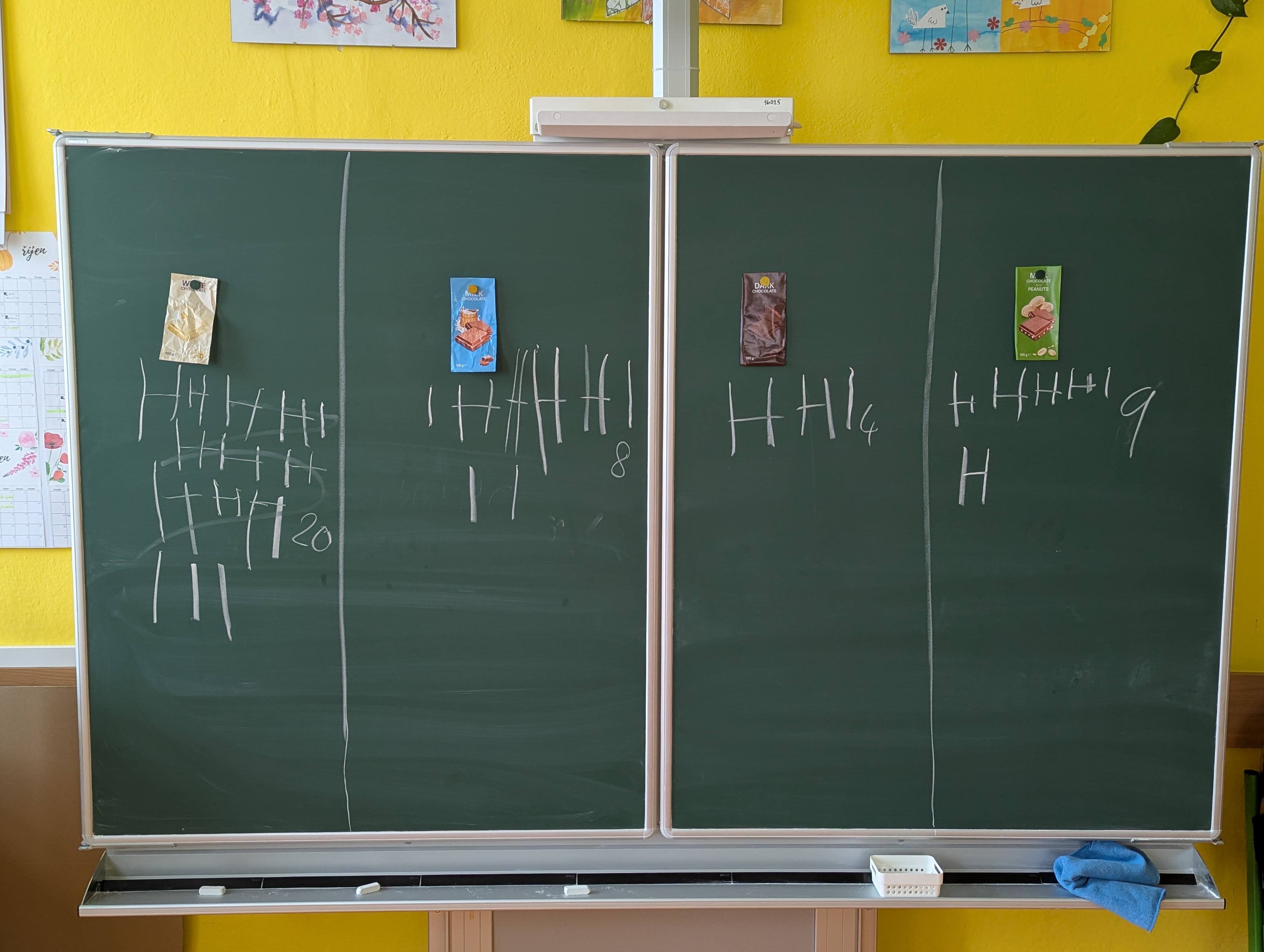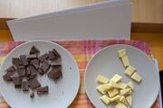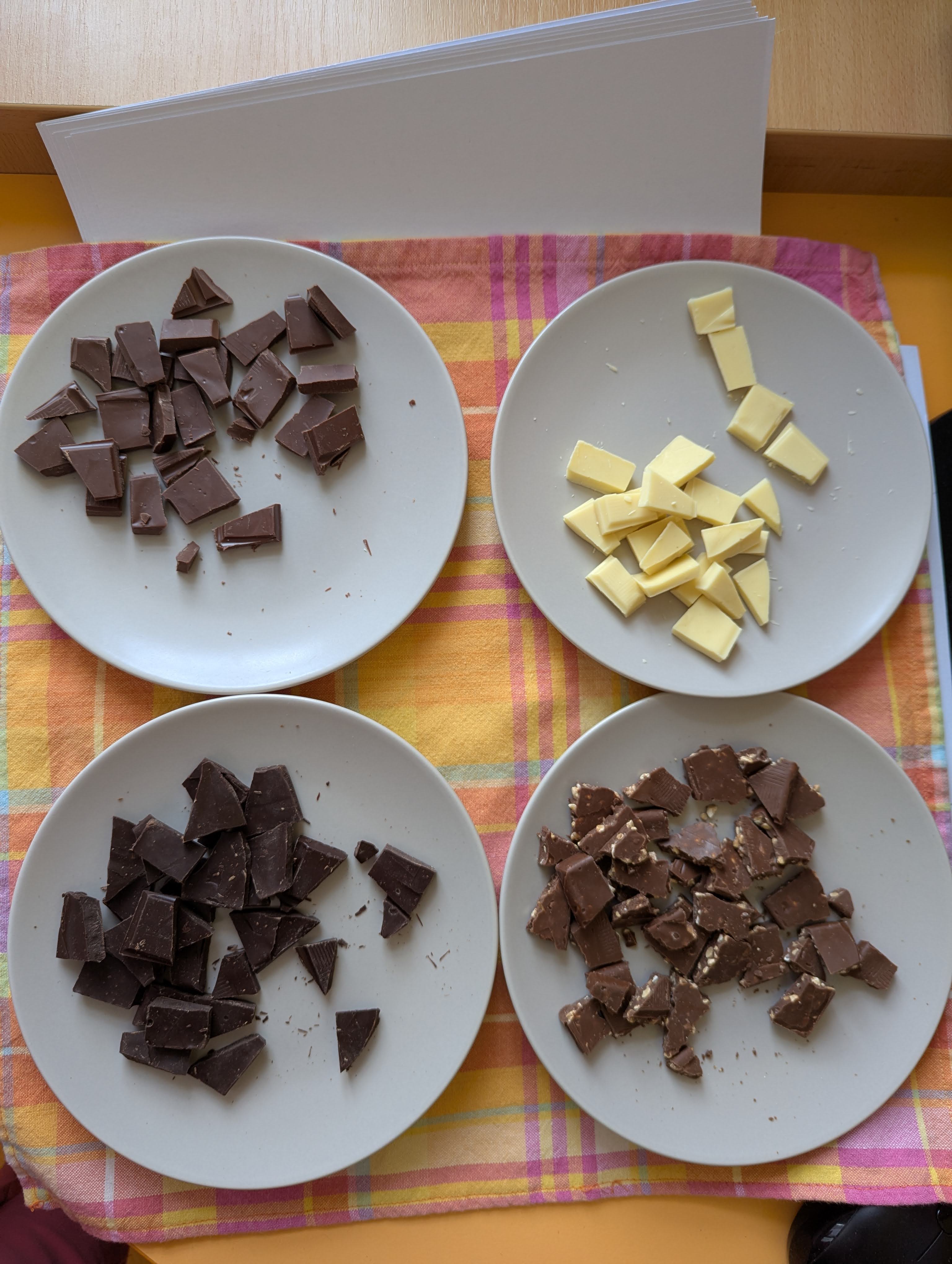 Ochutnávka a hlasování pro nejoblíbenější čokoládu. Výběr čokolády ze 4 druhů: mléčná, mléčná s lískovými ořechy, hořká a bílá.