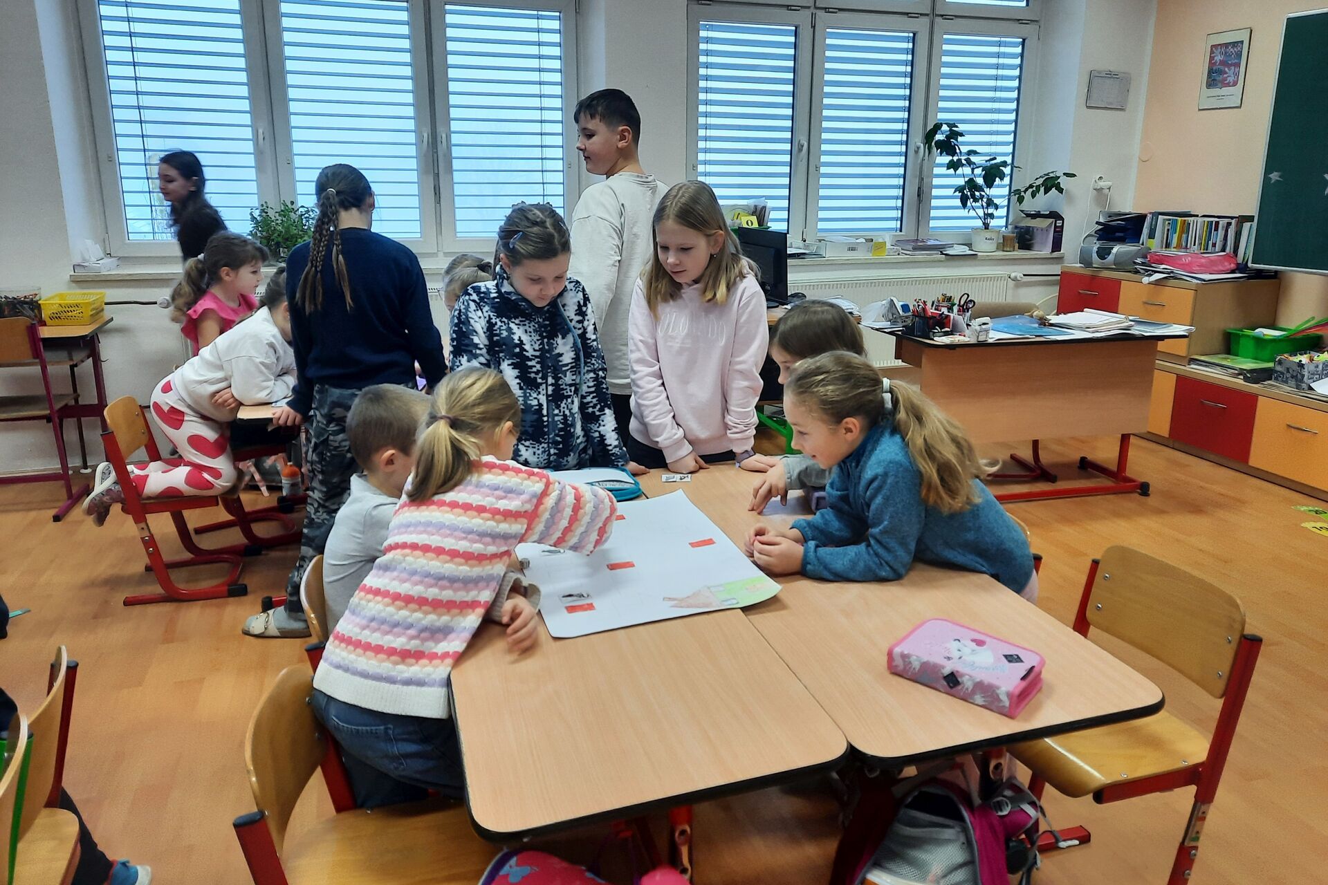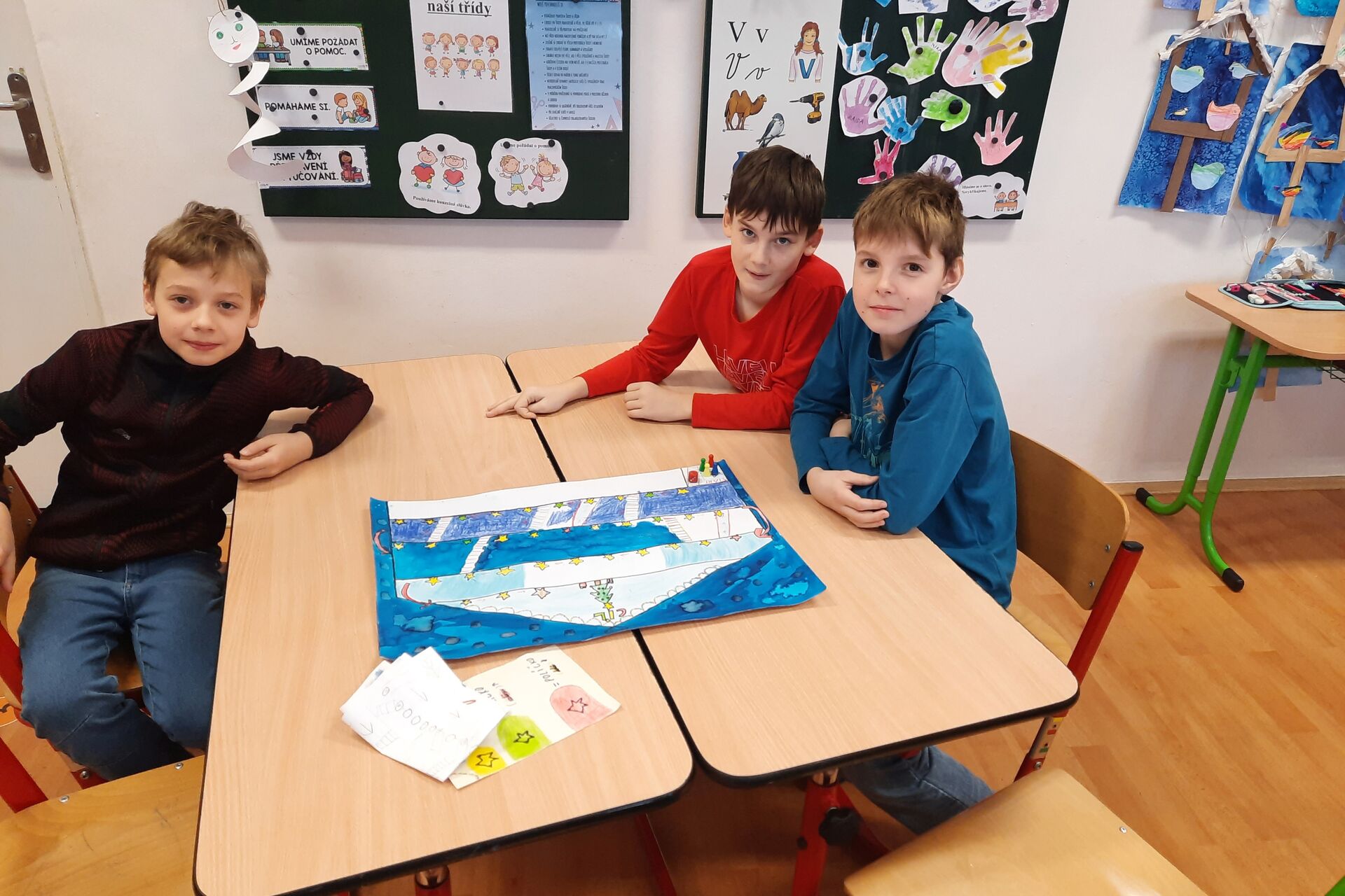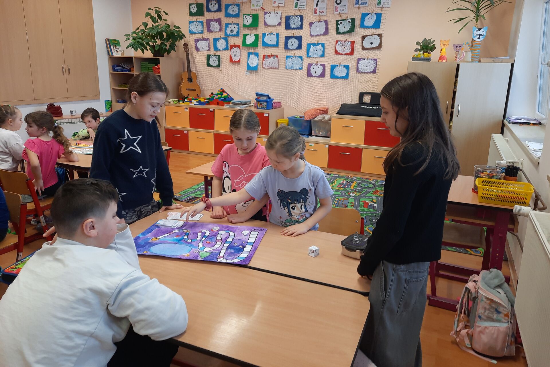 Ve čtvrtek 5. února 2026 přišli čtvrťáci a páťáci za prvňáčky s deskovými hrami, které sami vymysleli a vyrobili v barevných hodinách. Prvňáčci se hned pustili do hraní a bylo vidět, že je hry opravdu baví. Na závěr jsme společně zhodnotili, jak se hry povedly, a sdíleli jsme své dojmy z hraní. Celé setkání se neslo ve velmi příjemné atmosféře a všichni odcházeli spokojení.