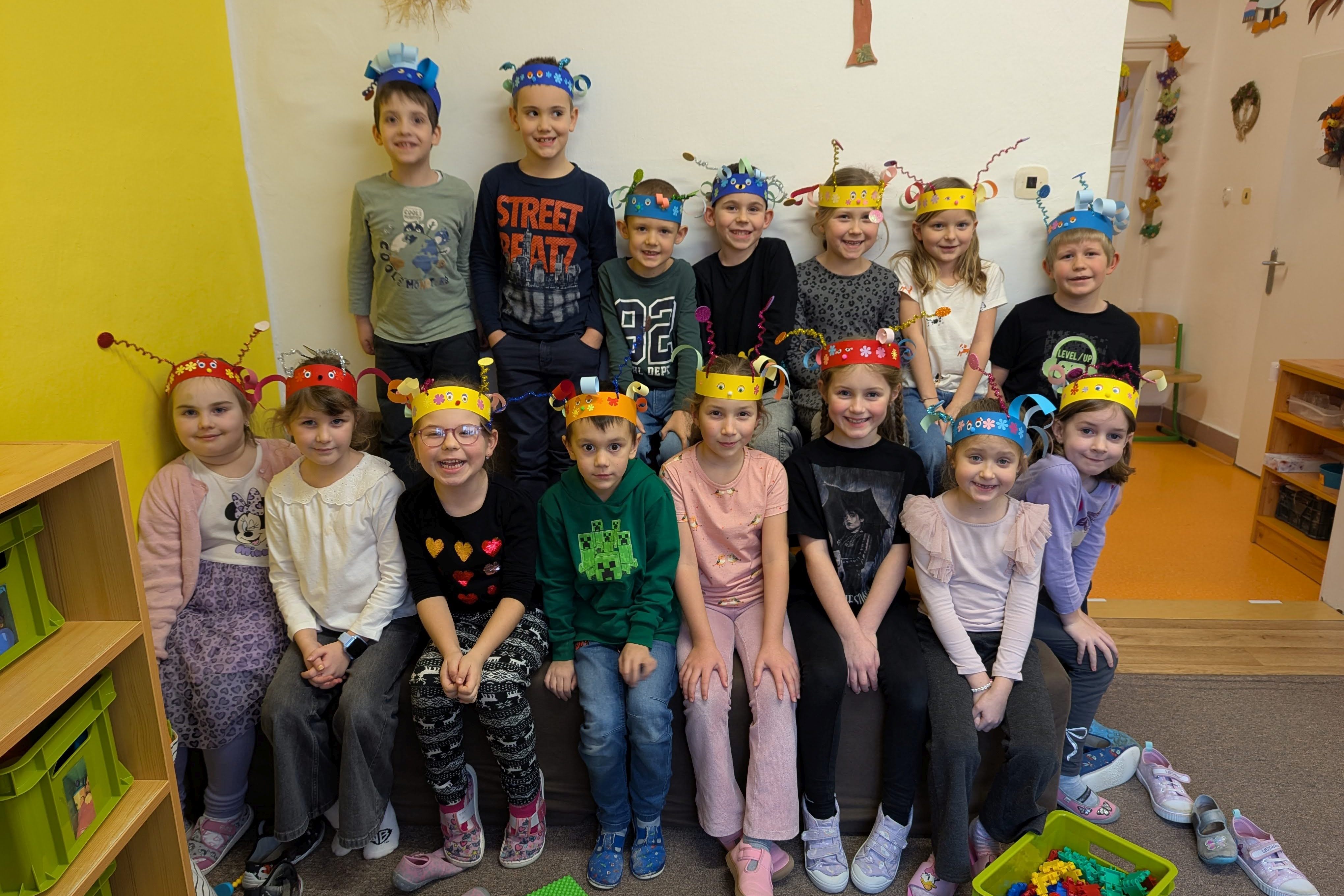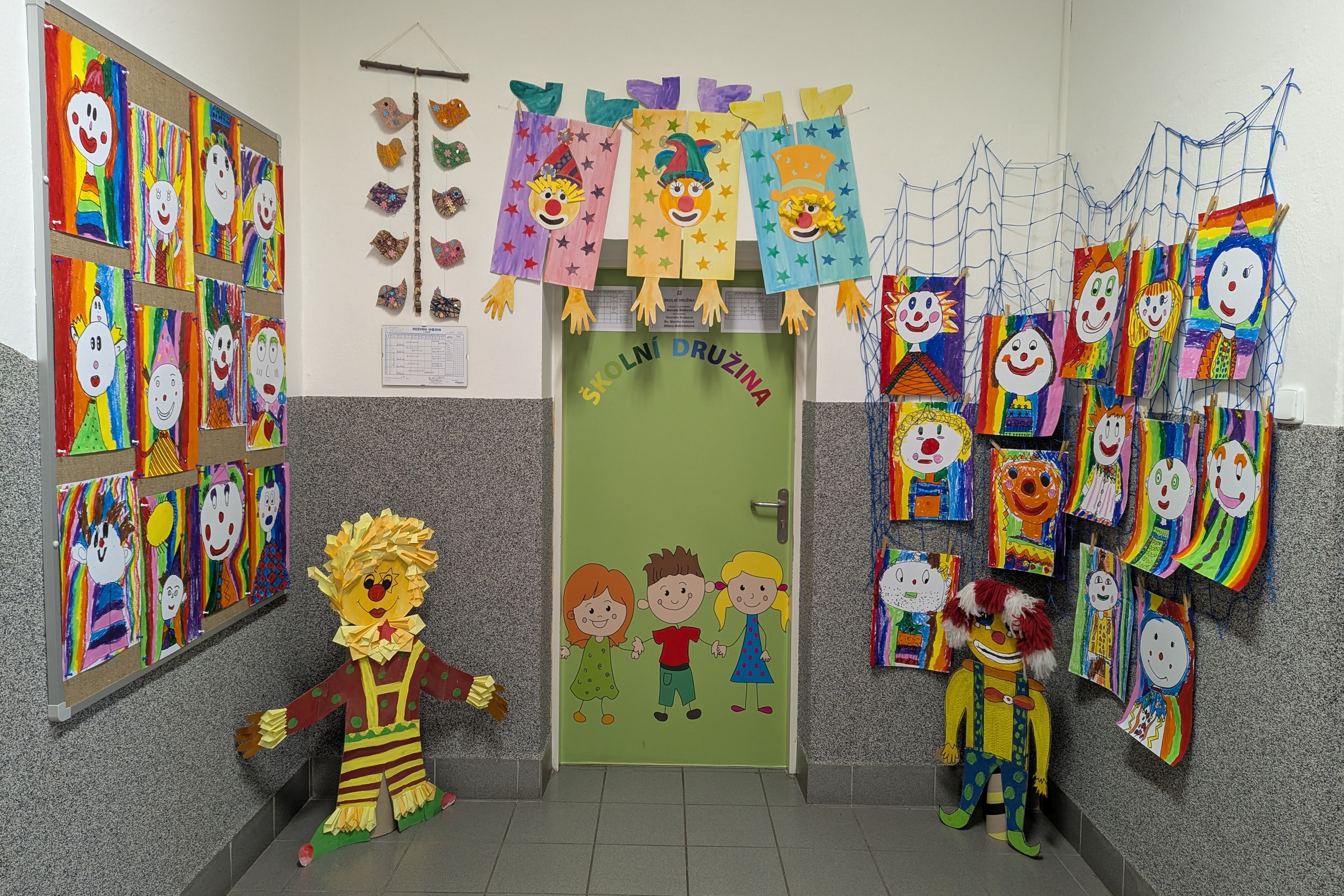 Naši chodbu rozzářila výstava malovaných šašků, kteří se na všechny zubí z nástěnek. Každý šašek je unikát se svou vlastní barevnou čepicí a širokým úsměvem. Aby byla proměna v karnevalové masky dokonalá, děti si s velkou trpělivostí vyrobily také pestrobarevné čelenky.